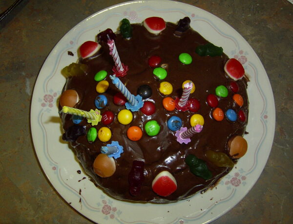 Celebrating xxxx 2004 Keeping things simple a Woolies mud cake, decorated with lollies by the birthday girl